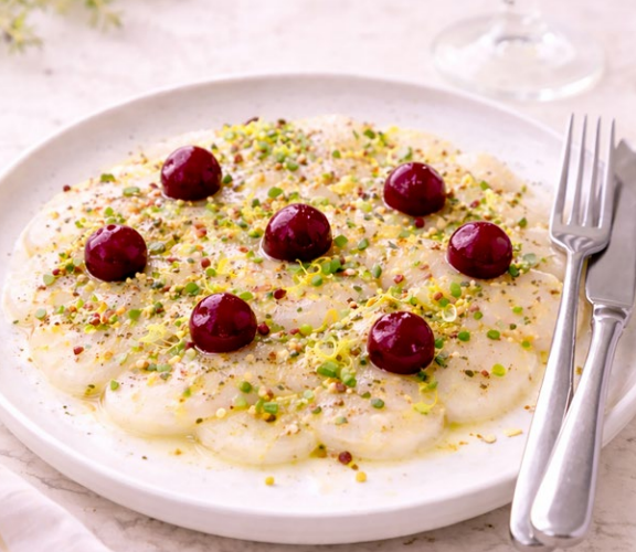 Déposez quelques griottes à la liqueur d’orange sur un carpaccio de Saint-Jacques juste avant de servir.