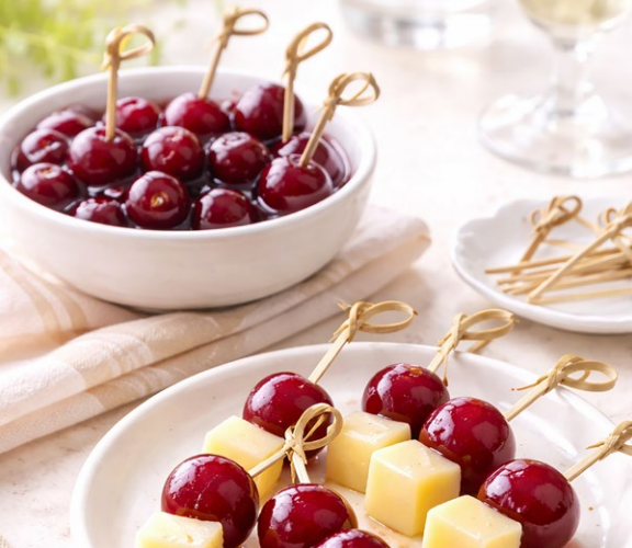 Ajoutez quelques griottes à la liqueur sur des dés de Comté pour un apéritif simple et gourmand.