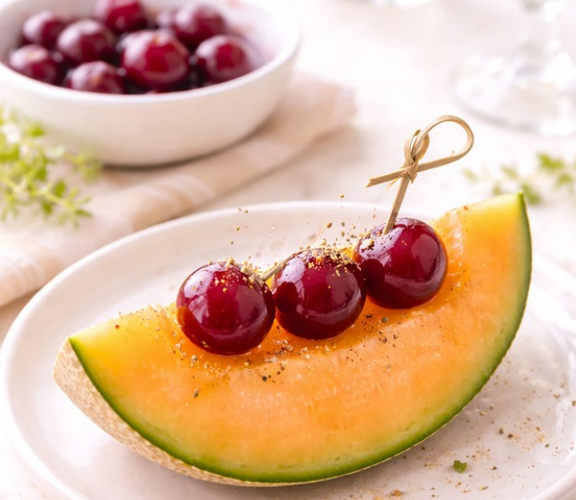 Ajoutez quelques griottes à la liqueur sur des morceaux de melon bien frais.