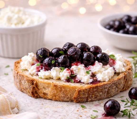Étalez le chèvre sur une tranche de pain, ajoutez quelques cassis et servez.